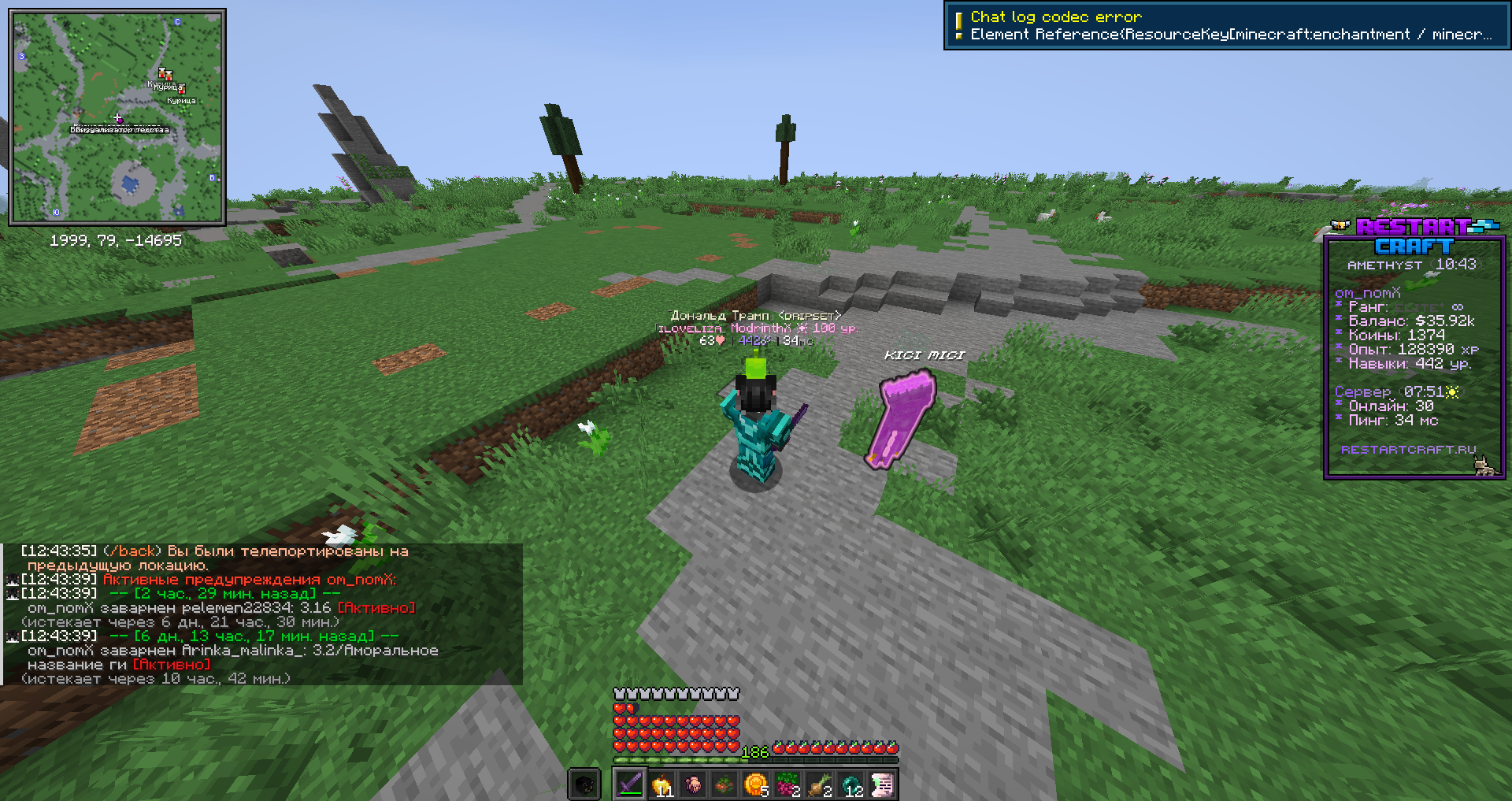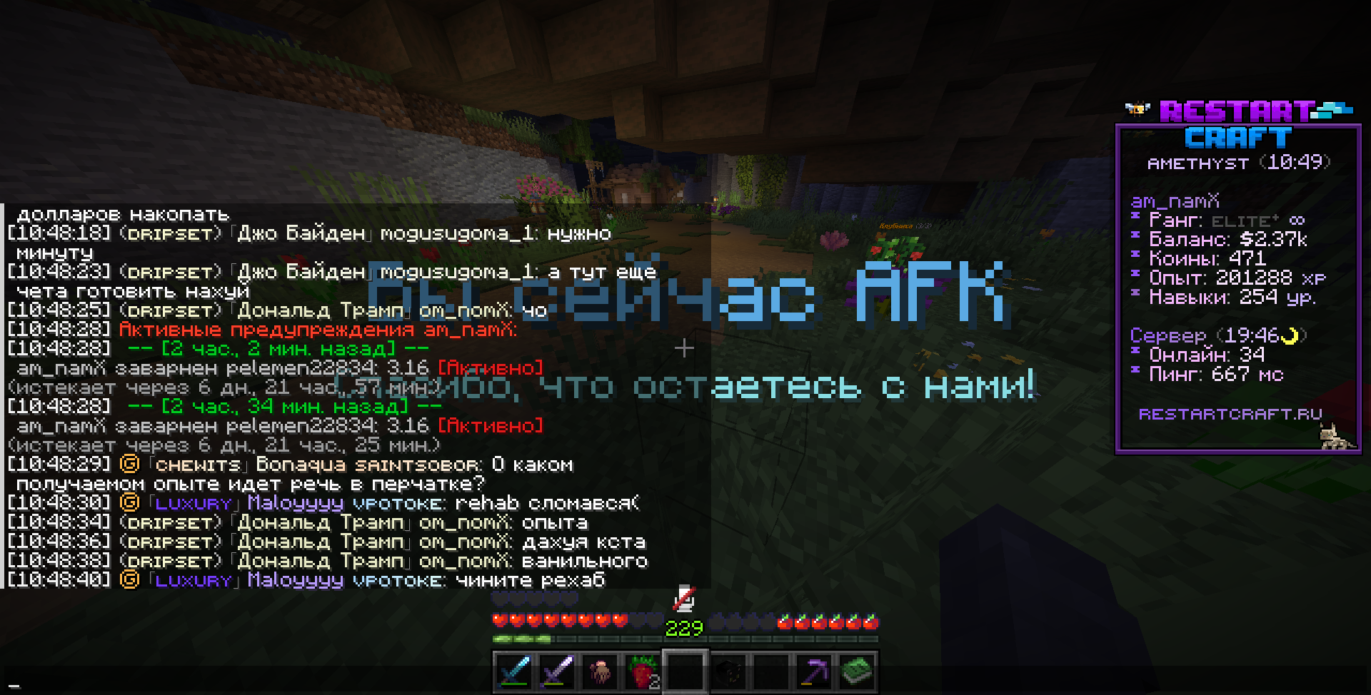 Lizer Ваш игровой ник: am_namX (om_nomX) Игровой ник администратора: pelemen22834 Суть жалобы: Вчера ночью построили регион +- 150-200 блоков от гхома хевенимпаер (в правилах не указан точное расстояние от чужого региона, многие администраторы говорили от 150 блоков), регион не нарушал никакие правила, понравилась сама территория. В регионе была красивая постройка, регион был удален, после удаления региона постройка оставалась, но на момент написания тикета постройка была снесена. Так же был выдан второй варн, за что не понимаю. Если все же это считается нарушением, то как поступать в другой раз что бы это не считалось нарушением? Скриншот наказания:
