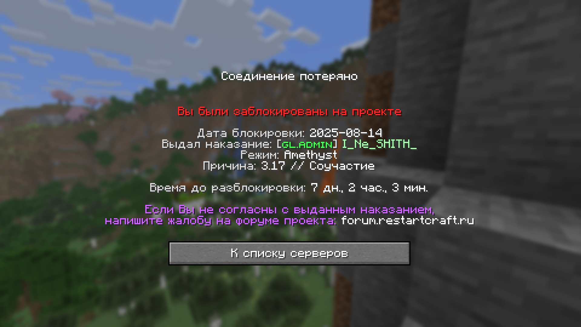 va1mi Вы были забанены за гриферство по жалобе. Отказано https://forum.restartcraft.fun/d/3048-nizvestnyy-grifer-sundukov-i-spavnerov/2