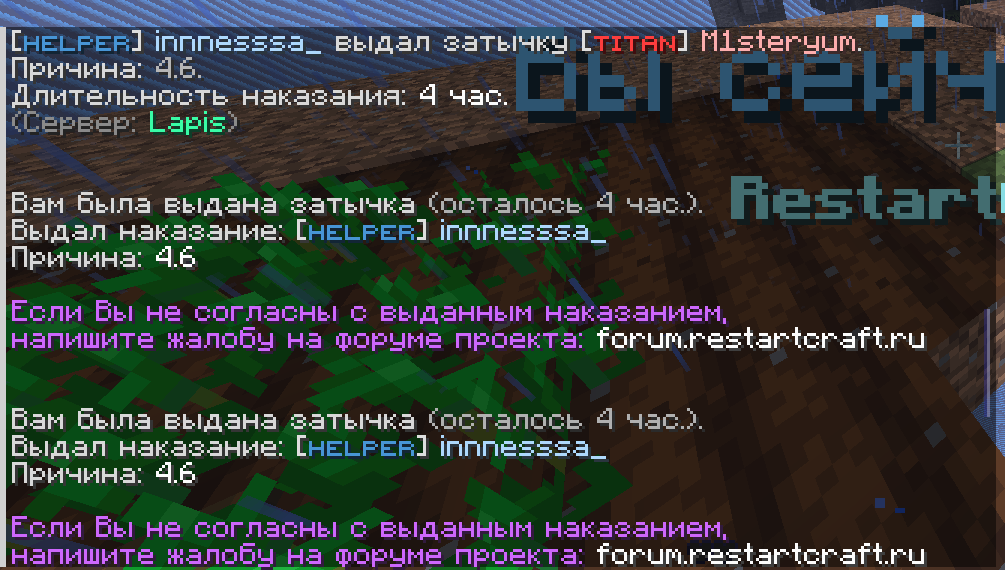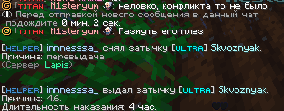 m1steryum Ваш игровой ник: [M1steryum] Игровой ник администратора: [inessaa] Суть жалобы: Я и skvoznyak общались в чате о своих вопросах, инесса потребовала не раздувать конфликт, ей было сказанно что конфликта нет, нам обоим выдали по 4ч мута, не 2 не 30мин, при том в чате не было не оскорблений не конфликта о чем мы сказали 4.