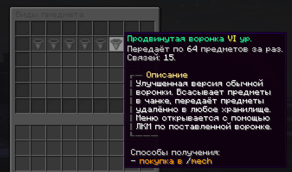 - Новая воронка передаёт предметы с ванильной скоростью, раньше было раз в 3 секунды, сейчас скорость составляет 8 тиков (примерно 0.4 сек).