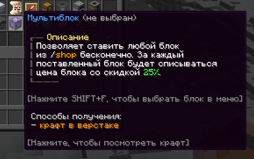 - Новый предмет, который позволяет бесконечно ставить блоки из /shop. За каждый поставленный блок списывается цена блока со скидкой 25%.