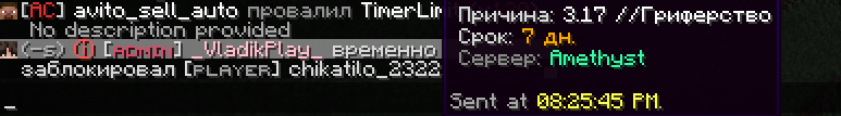 Air_mag Ваш игровой ник: Air_mag Игровой ник нарушителя: chikatilo_2322 Суть жалобы: Игрок нарушил правила 3.2, также есть воозможное нарушение правила 3.17 - убийство обманным путем, так как игрок-новичек к нему телепортировался и после этого произошли убийства данного игрока Доказательства: