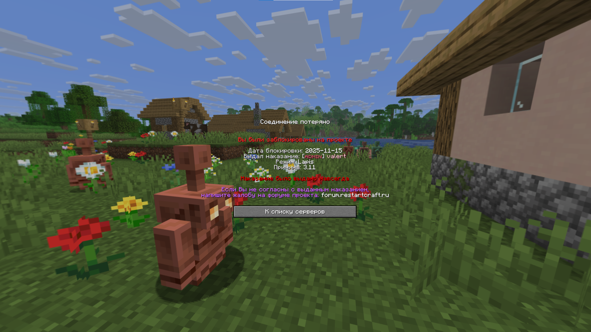 va1mi ia hz kto eto а когда это было ? На скриншоте указаны даты. 3.11. Запрещается продажа/передача игрового аккаунта. Также запрещен обмен любых игровых предметов на реальные деньги (кроме покупки через сайт проекта https://restartcraft.ru/). Наказание: Блокировка аккаунта навсегда В обжаловании отказано.