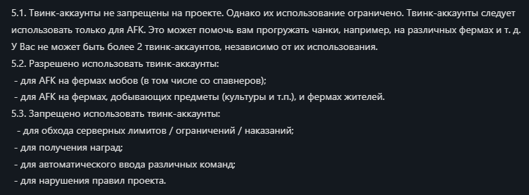 - Суть жалобы: [Здравствуйте. Модератор Инесса выдала бан моему твинку за нарушение правил 5.3. по причине того, что я его якобы использовал для получения наград. В заданиях есть квест на короткий лук, выстрелить 1000 раз и он за считывался моему твинку, когда я стоял им в афк режиме и стрелял из короткого лука в своего основного персонажа, чтобы прокачать (основе) рпг умение защита. Она мне привела пример для каких целей используется твинк, указав на 5.2. пункт правил, затем п.1.1. И сказала, что твинк должен быть на “моем” острове. Но я являюсь участником острова на котором живу с ребятами и твинк был добавлен в кооператив (я остров не создавал со старта). Я играю с твинком 1 раз, правил никогда не нарушал, периодически их перечитываю. Так же есть задание на добычу 1млн. блоков в генераторе руды и оно засчитывается твинкам в афк режиме, но за это не банят. Получается, что они на генераторе тоже нарушают 5.3. пункт правил. Я объяснил модератору, что это недоразумение, мне награды не нужны с твинка и я получаю все на основу. Но мне прелетел бан и отправили меня на форум, писать тикет, сославшись на ст. администрацию, если разрешат, то меня разбанят. Прошу разбана моего твинк аккаунта т.к. я честный игрок и считаю, что это недоразумение из-за недопонимания правил, т.к. там нет особо конкретных уточнений. Я же не виноват, что оно в афк и этот кв. засчитывает. Как же тогда на генераторе стоять? Это не то чтобы жалоба, просто считаю, что это недопонимание обеих сторон.]