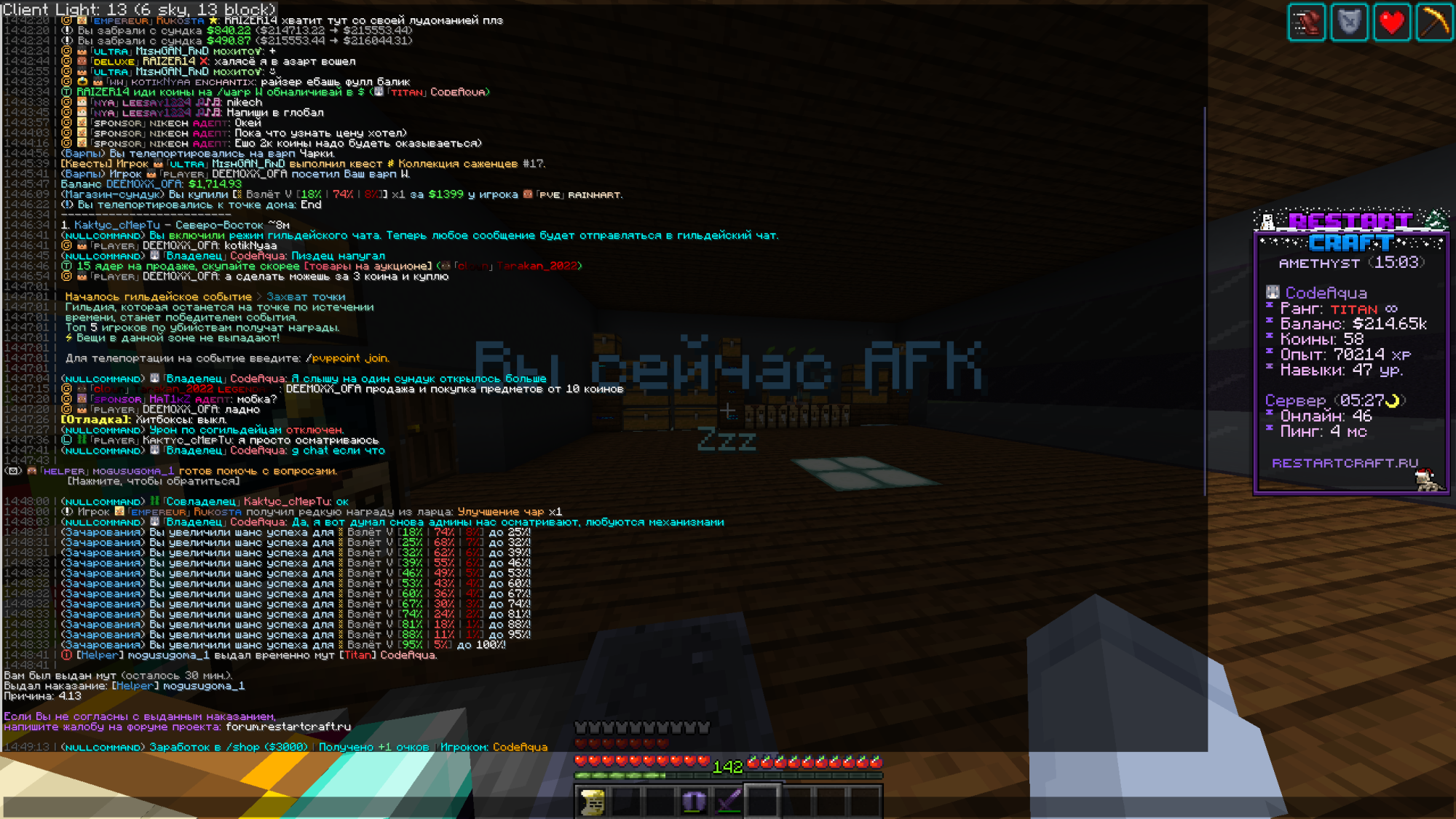 CodeAqua CodeAqua mogusugoma_1 В торговом чате предложил человеку обменять коины на $, указав торговый варп, где это можно сделать, через 5 минут прилетает мут по 4.13. Если даже торговые варпы обязательно нужно указывать в объявлениях, то я готов принять подобную вину, но тем не менее я не считаю правильным отсутствие попытки даже объяснить за эти 5 минут совершённую ошибку в теме, где правило может легко восприняться некорректно